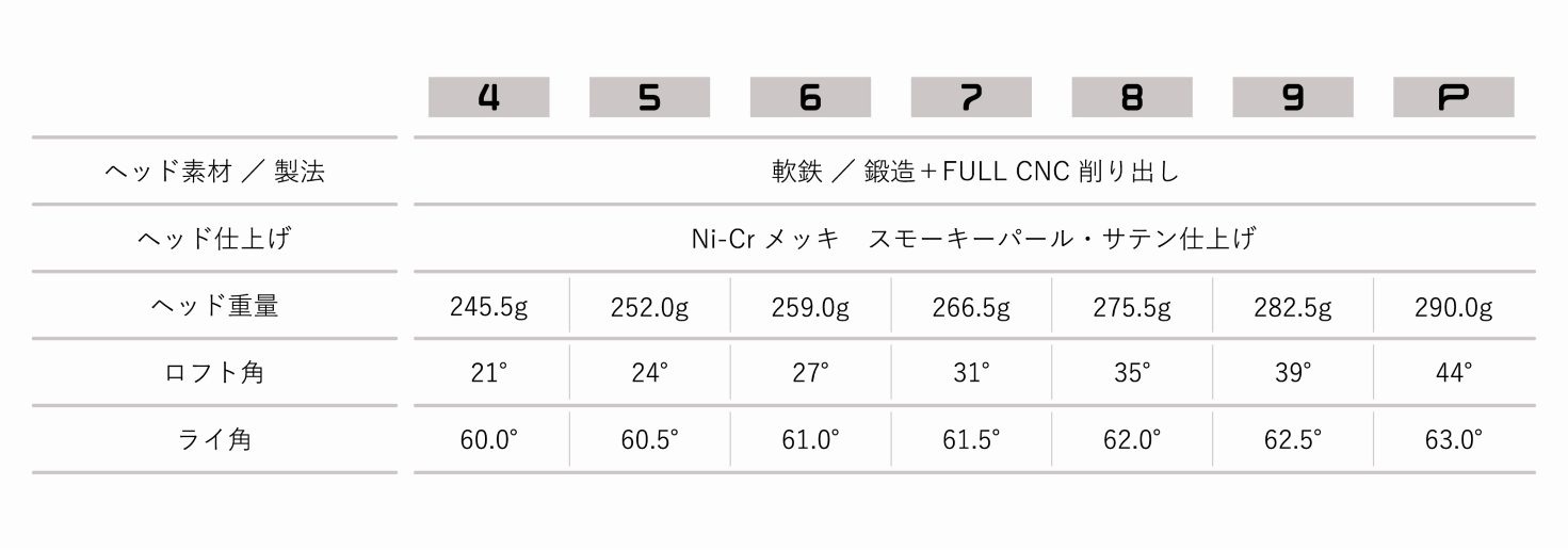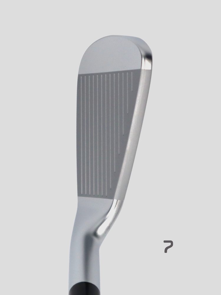 ツアー会場のタフなコースセッティングでも使いこなせるサイズ感を維持しつつ、シンプルなデザインのまま、#7で2800g・㎠を超えるクラス最大級の慣性モーメントを実現。さらに完全な3次元デジタル重心設計を施し、大慣性モーメントドライバーとの相性がよくなる位置に、番手間が滑らかにフローする重心位置を正確に設計。近年のトレンド的なスイングシステムで、安心してフルスイングをすることができます。