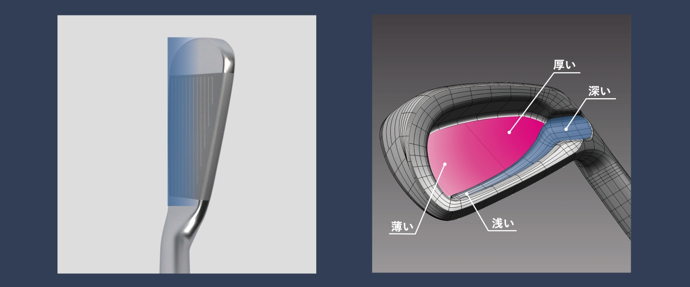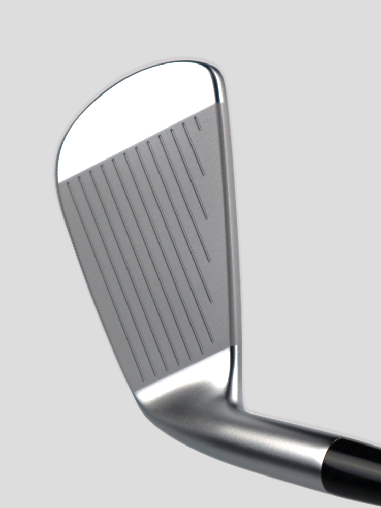 スイングのトレンドとなる、フェースの向きを保つ動きをヘッド形状そのものでサポート。グースネックとは異なり、ロフトごとに変化するフェースの見え方を数学的に解析し、ターゲットに対して「面」をキープしたまま振り抜ける「ボックス感」を追求。従来の「打点コントロール」の達人たちが求めてきた形状とは一線を画した、安心感のあるヘッド形状。