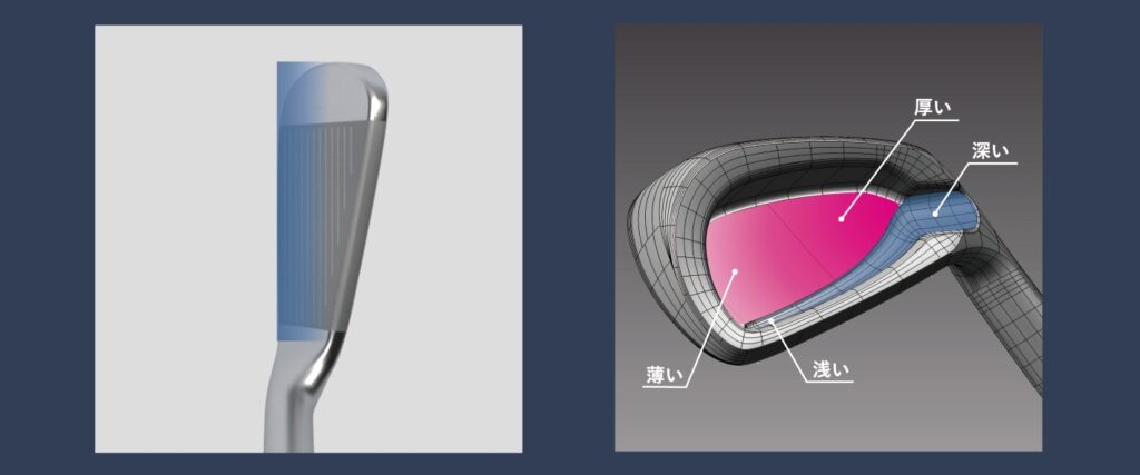 一般的な鍛造製法では難しい、強烈なアンダーカット構造を全番手に採用するとともに、tTウェッジ2.0の流れをくむ「サンクンデザイン」をキャビティ内部に施すことで、高慣性モーメント化を実現。さらにキャビティ内部の肉厚が均一とならないよう、各番手異なるバリアブルな肉厚変化を正確に削り出すことで、ミッドサイズのキャビティアイアンとは思えない、感性に響く心地よい上質な打感を実現。