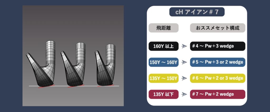アイアン選びの基準を見直し、ロング番手の打ちやすさや、ヘッドスピードに合わせた最大飛距離アップを求めるのではなく、打てる番手、使うことが多い番手の快適さを優先して選ぶ。そのためにcHアイアンの#7アイアンで心地よく打つことができる飛距離をもとに、どの番手までが余裕をもったセットとして使えるかを提案。1番手から購入可能なので、自身が快適に使える番手だけを選択可能です。