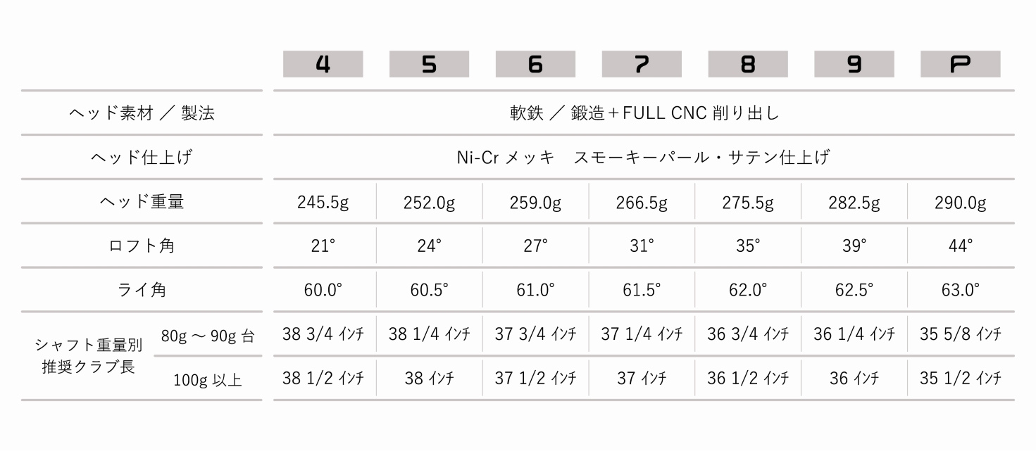 ツアー会場のタフなコースセッティングでも使いこなせるサイズ感を維持しつつ、シンプルなデザインのまま、#7で2800g・㎠を超えるクラス最大級の慣性モーメントを実現。さらに完全な3次元デジタル重心設計を施し、大慣性モーメントドライバーとの相性がよくなる位置に、番手間が滑らかにフローする重心位置を正確に設計。近年のトレンド的なスイングシステムで、安心してフルスイングをすることができます。