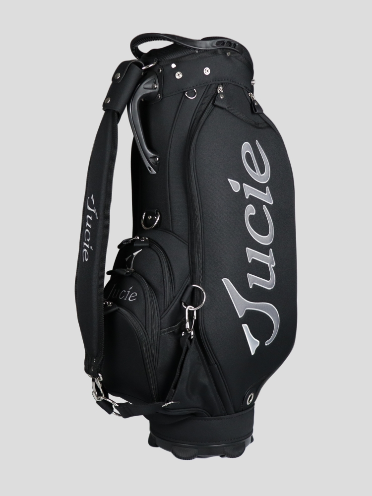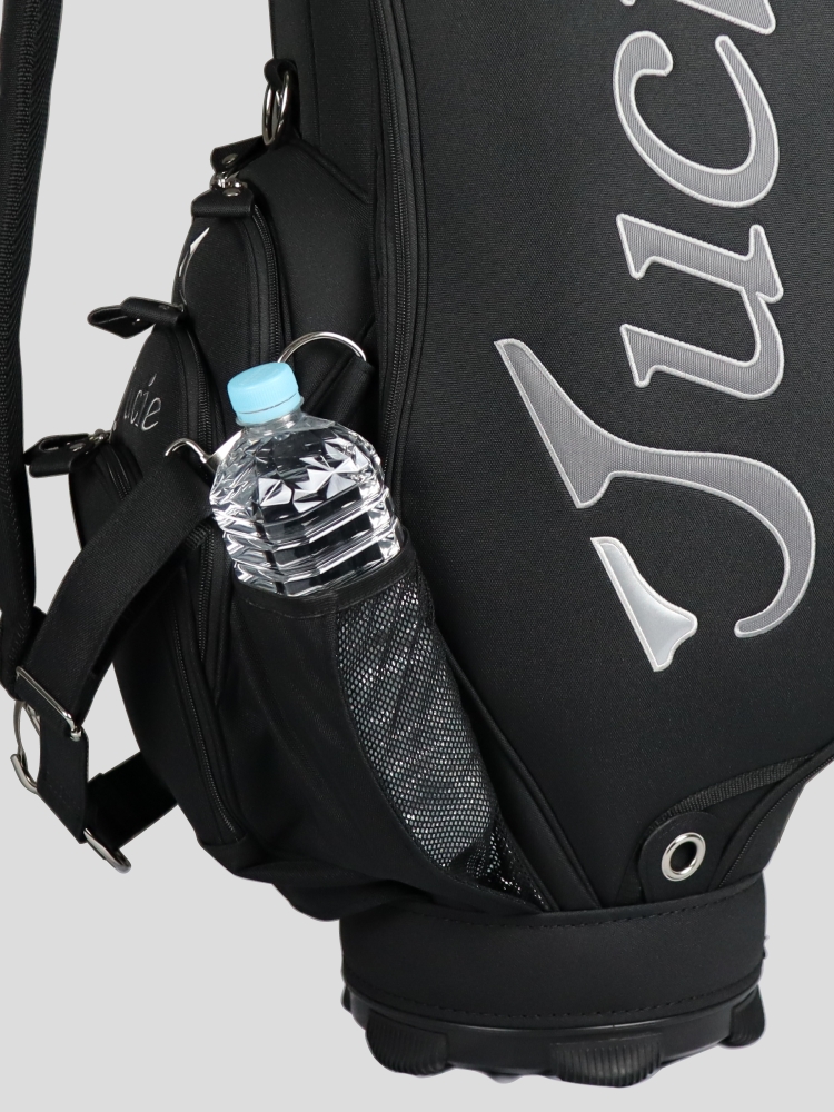 ツアー選手の使用環境に耐える丈夫な3点式ショルダーベルト搭載。水筒や1000mlサイズのペットボトルが収納できる大型のドリンクホルダーを、フロントポケット両サイドの2か所に配置